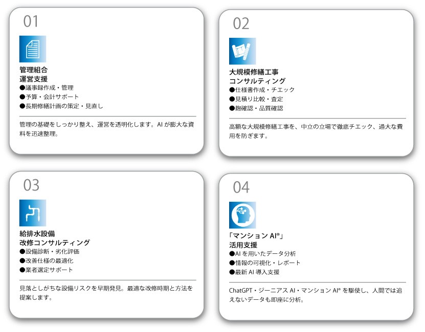 規模・築年数・設備の種類を問わず、幅広いマンションに対応しています。管理組合運営・大規模修繕・給排水設備改修・AI活用など、課題の種類に合わせて最適なサービスをご提案します。