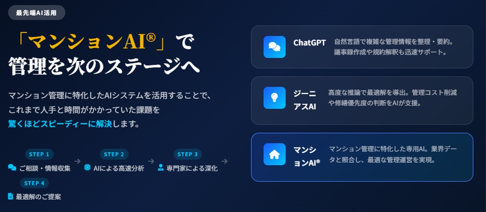 マンション管理に特化して開発されたAIシステムです。ChatGPTやジーニアスAIと組み合わせて活用し、管理コスト分析・修繕計画最適化・設備診断など、マンション管理の専門的な課題を高速かつ精緻に分析します。